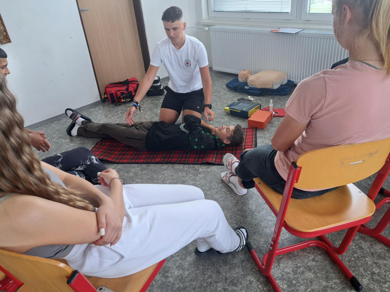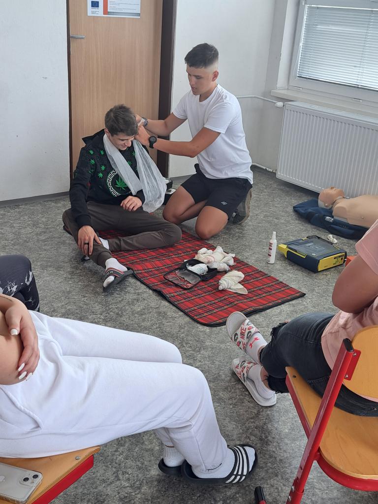 Dňa 27.6.2024 žiaci 9. ročníka absolvovali spolu s Červeným krížom zdravotnú prípravu. V prvej časti žiaci získali teoretické i praktické vedomosti z oblasti Prvá pomoc.  Žiaci sa  naučili resuscitovať dospelého človeka a dieťa, používať automatický externý defibrilátor AED, ošetriť drobné aj závažnejšie úrazy či popáleniny, správne použiť trojrohú šatku, ale aj ako postupovať pri dopravnej nehode a správne telefonovať na tiesňovú linku.